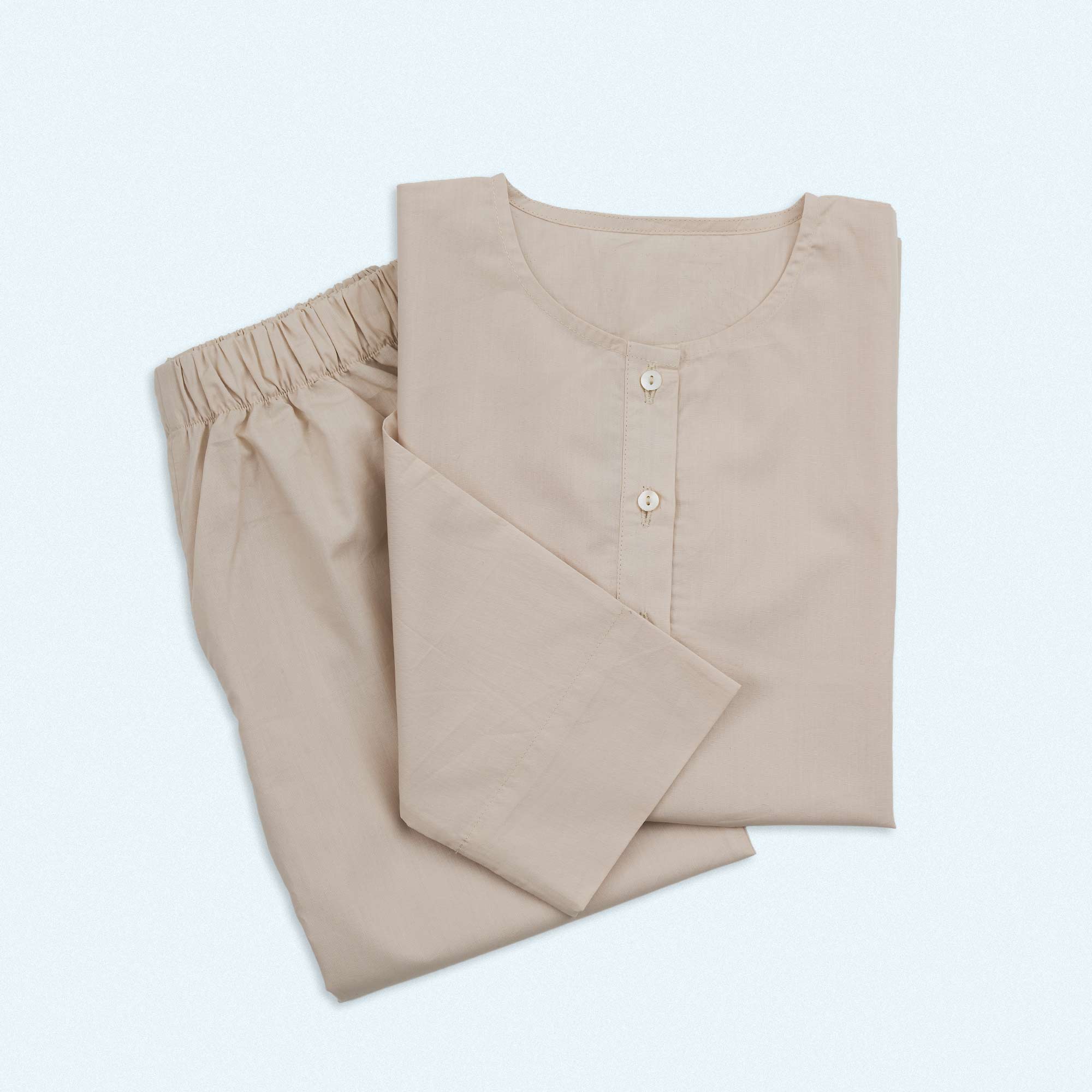 Skjorten har en enkel kinakrave, der giver et tidløst og rent udtryk, mens de matchende bukser sidder komfortabelt med en blød elastik.
